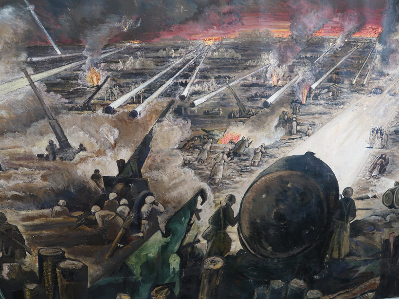 Geschöntes Öl-Gemälde über den Einsatz von 140 Flak-Scheinwerfern der Sowjetarmee. Durch den Staub und Nebel wurde in Wirklichkeit das Licht reflektiert und blendete die sowjetischen Soldaten. Sie waren von den deutschen Soldaten gut zu erkennen und auszuschalten. |