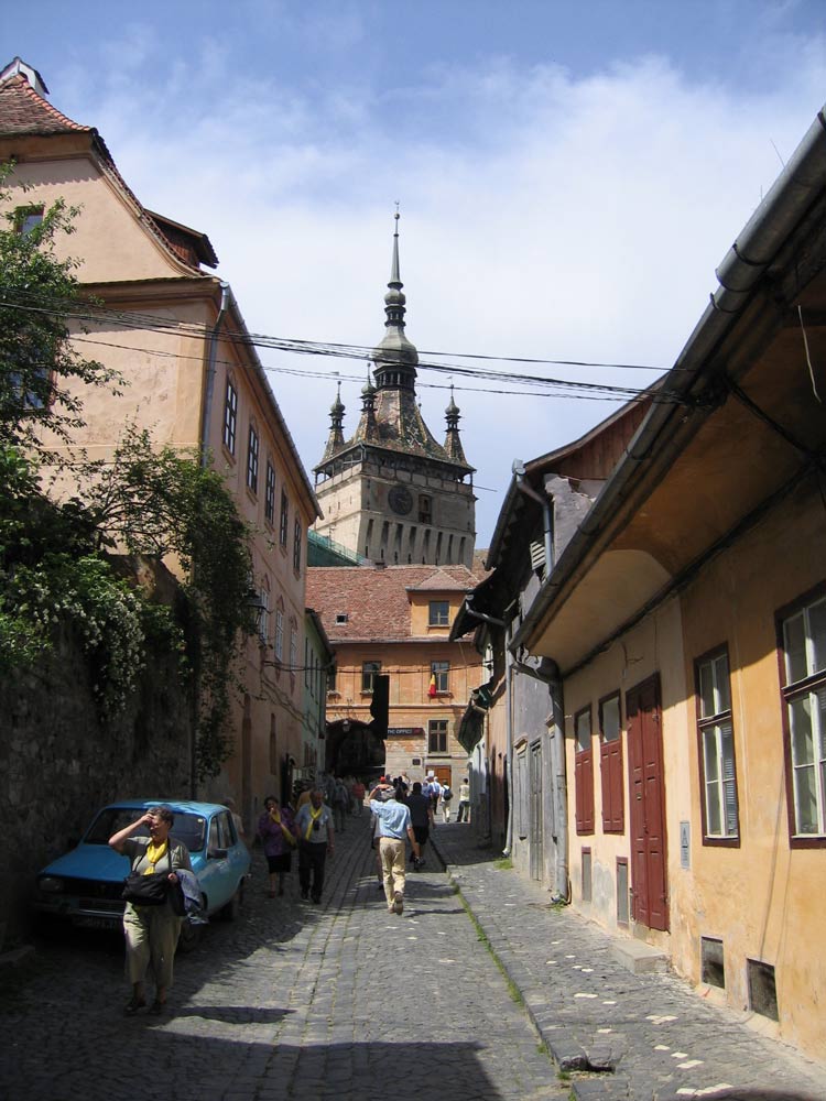 Straße zur Oberstadt von Sighisoara (Schäßburg). Das Wahrzeichen der Stadt, der Stundturm, ist zu erkennen. |