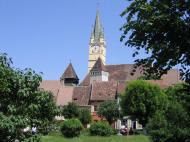 Die Kirchenburg aus dem 15. Jh. von Medias (Mediasch) in Rumänien. Im Inneren der Maragretenkirche sind eine große Anzahl von osmanischen Teppichen. |