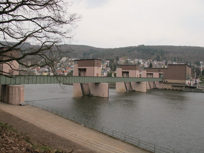 Der Neckarsteig überquert die Schleuse von Neckarsteinach, die 1931 erbaut wurde. |