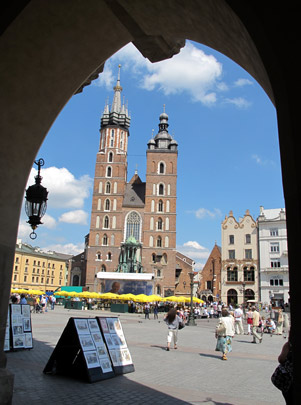 Am Hauptmarkt von Kraków (Krakau) befindet sich die Kościól Mariacki (Marienkirche) mit ihren ungleichen Türmen Der höhere war Wachtturm, der kleinere Glockenturm. |